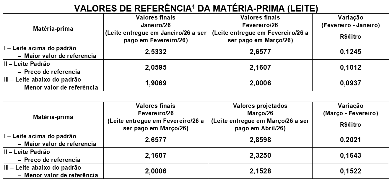 A diretoria do Conseleite Santa Catarina reunida em Chapecó no dia 27 de Fevereiro de 2026 atendendo os dispositivos disciplinados no artigo 15 do seu Estatuto, inciso I, aprova e divulga os valores de referência da matéria-prima leite, realizados no mês de Janeiro de 2026 e a projeção dos valores de referência para o mês de Fevereiro de 2026.