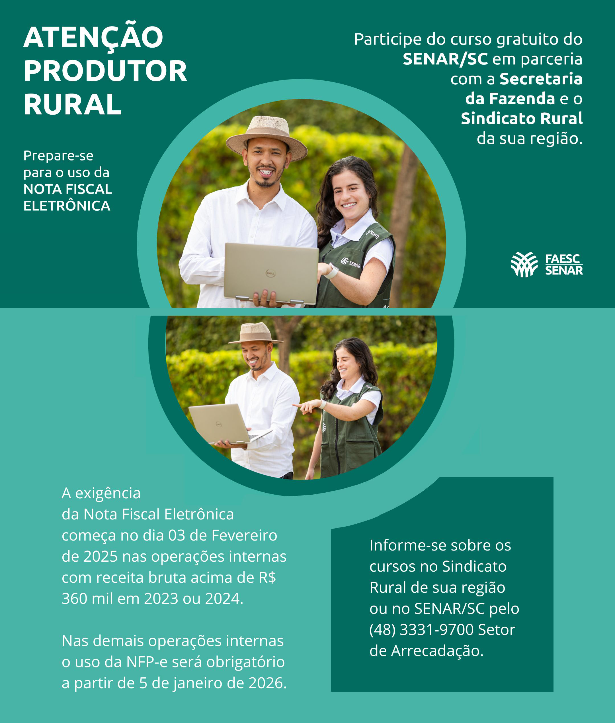 O Sistema Faesc/Senar (Federação da Agricultura e Pecuária do Estado de Santa Catarina e Serviço Nacional de Aprendizagem Rural de Santa Catarina) reforça aos produtores rurais para que fiquem atentos à data de início do uso obrigatório da Nota Fiscal de Produtor Eletrônica (NFP-e) – adiada recentemente pelo Conselho Nacional de Política Fazendária (Confaz).