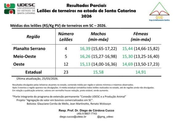 O Grupo de Melhoramento Genético (GMG) da Universidade do Estado de Santa Catarina (Udesc) divulgou, nesta semana, o terceiro resultado parcial dos leilões de terneiros de 2026. A iniciativa conta com o apoio da Federação da Agricultura e Pecuária do Estado de Santa Catarina (Faesc), parceira dos eventos agropecuários realizados no Estado. Até o momento, foram contabilizados 23 leilões, o que evidenciou a valorização dos preços de comercialização em diferentes regiões catarinenses.