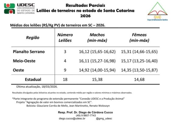 O segundo resultado parcial dos leilões de terneiros de 2026 foi divulgado nesta semana pelo Grupo de Melhoramento Genético (GMG) da Universidade do Estado de Santa Catarina (Udesc). A iniciativa conta com o apoio da Federação da Agricultura e Pecuária do Estado de Santa Catarina (Faesc) – parceira dos eventos agropecuários realizados no Estado.