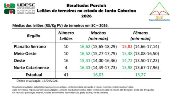 O Oeste, que concentra o maior número de leilões até o momento (16), registra médias mais moderadas: R$ 15,31 para machos e R$ 14,72 para fêmeas. Já o Norte Catarinense, com quatro eventos, apresenta uma das cotações mais altas para fêmeas, em R$ 15,98/kg, e R$ 16,33 para machos.