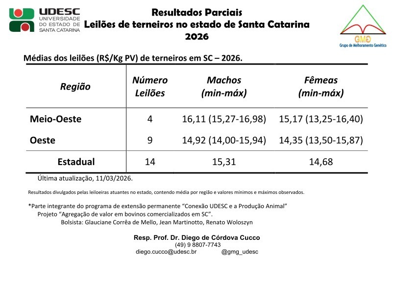 Começou a divulgação dos resultados dos Leiloes de terneiros de 2026. A Federação da Agricultura e Pecuária do Estado de Santa Catarina (Faesc) reforça aos pecuaristas catarinenses para que confiram o primeiro resultado parcial deste ano. Os dados, atualizados nesta semana, foram divulgados pelo Grupo de Melhoramento Genético (GMG) da Universidade do Estado de Santa Catarina (Udesc).
