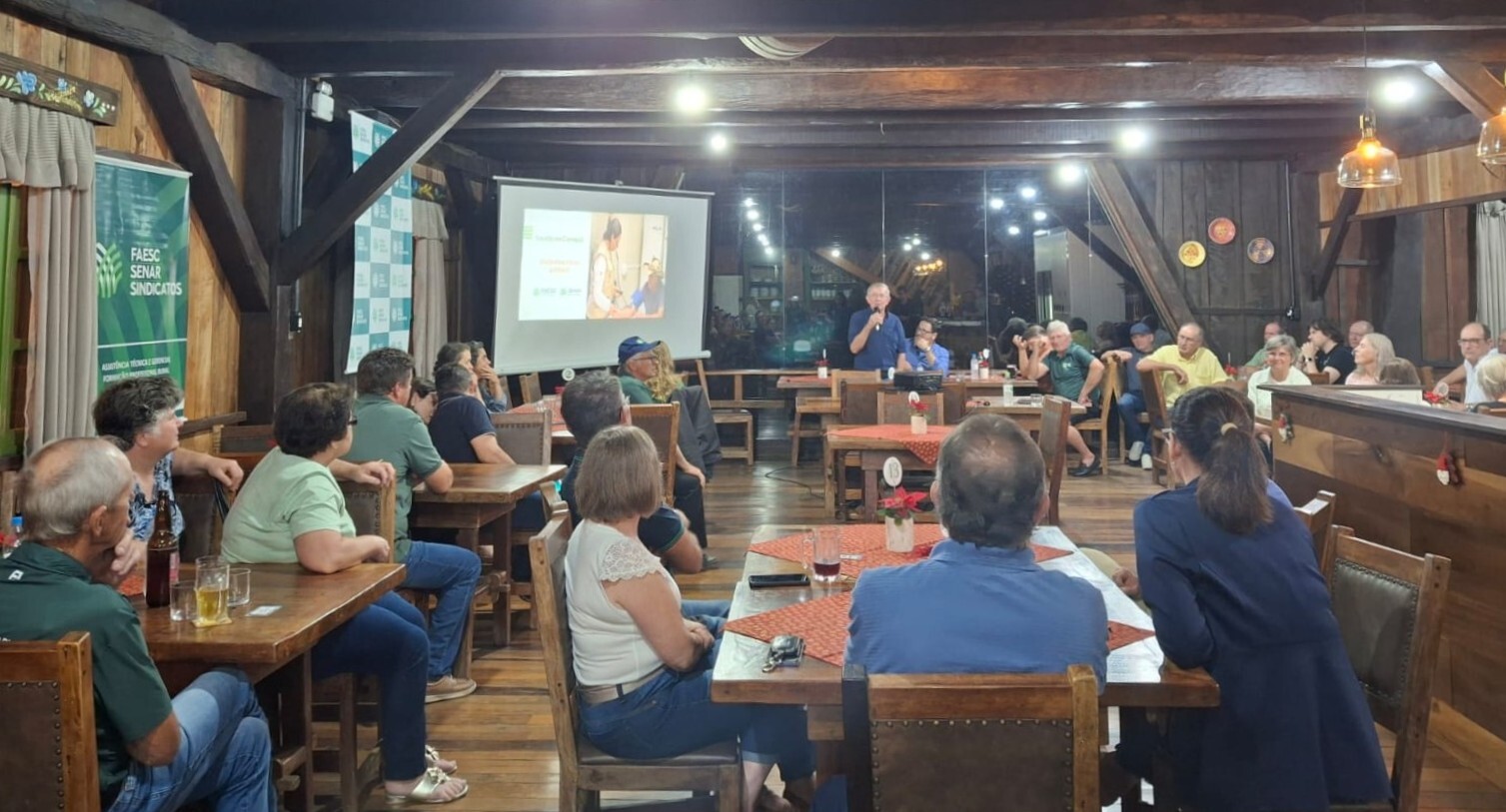 Na sequência, o supervisor regional do Senar/SC, Ricardo Costa, transmitiu a mensagem institucional em nome do Sistema Faesc/Senar e ressaltou as ações desenvolvidas em parceria com os Sindicatos nos municípios atendidos. Entre as principais iniciativas destacadas estiveram a Assistência Técnica e Gerencial (ATeG) e as atividades de Formação Profissional Rural (FPR) e Promoção Social (PS). Ele também explicou como será a implementação do Programa Saúde no Campo, que após o sucesso no Meio Oeste neste ano, será implementado em todo o Estado em 2026.