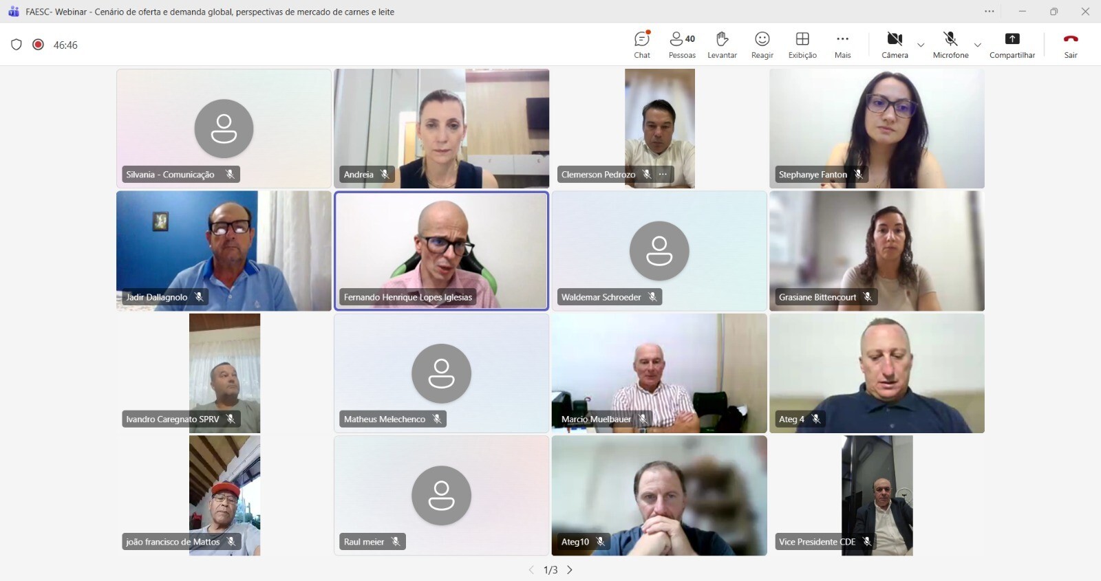 “Cenário de oferta e demanda global e perspectivas de mercado de carnes e leite” foi o tema do primeiro webinar de 2026 promovido pelo Sistema Faesc/Senar em parceria com a com a Safras & Mercado, consultoria especializada em agronegócio. A iniciativa integra o ciclo bimestral de palestras promovido pelas entidades para atualizar lideranças e produtores rurais de Santa Catarina sobre o cenário macroeconômico e as tendências das principais cadeias produtivas.